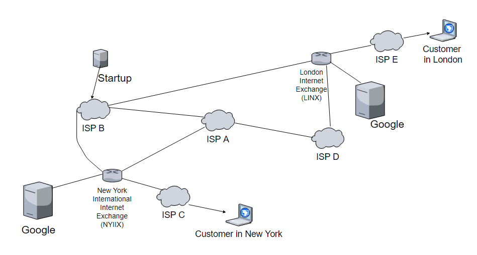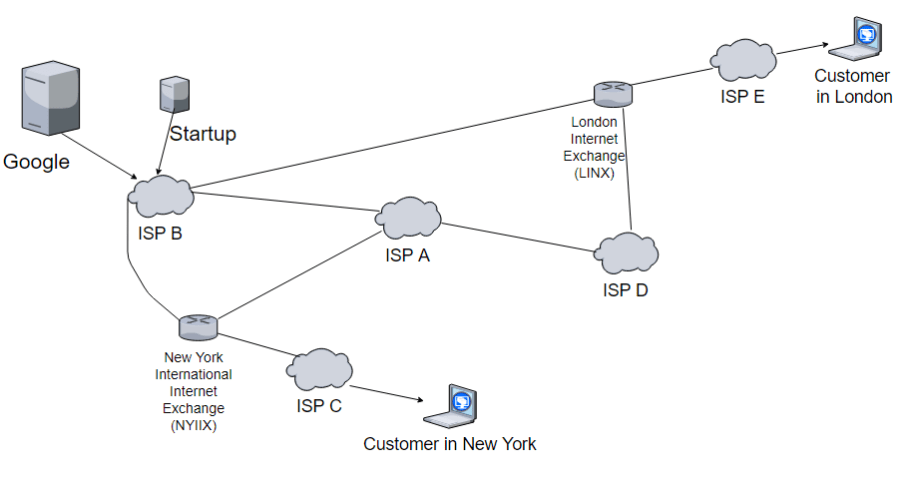 As the diagram shows below, Google (as well any smaller enterprises, including start-ups) pays ISP B for service. ISP B then routes traffic to the Internet Exchange Point (IXP) in New York, where it peers with the access-ISP C. Customers of ISP-C (this would be you, sitting at your computer at home) now have access to YouTube, Gmail, and all the other services Google offers.