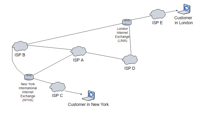 Lastly, on this diagram, we have two internet exchange points. Recall in the first diagram, we saw these connected IXP points between networks. (1) The New York International Internet Exchange (NYIIX) and (2) the London Internet Exchange (LIIX). These are two of the many internet exchange points that exist around the world. These physical locations are large hubs where independent networks exchange traffic with one another.