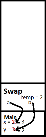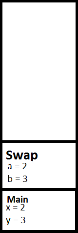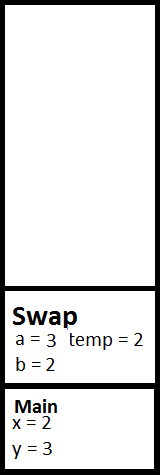 As you can see, we exit out of Swap and the variables a, b and temp all go out of scope, and they are immediately deleted. We are back in main, the values of x and y still hold their original values.