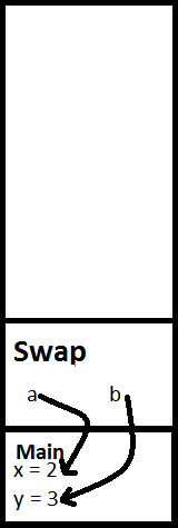 As you can see, a and b are now pointers. They are pointing to x and y. This is a great visual to understand the difference between what pass by value is and pass by pointer.