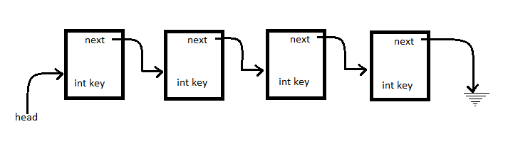 Here is what a typical linked list would look like. You have the first pointer to the start of the linked list called head. Each element of the list, called a node, contains some “key” which can be anything. I’m just using an integer in my example, however when you design your own linked list, this can be a pointer to some other structure, it can be an array, it can be multiple integers and a string. It’s entirely up to you what data the node holds internally.