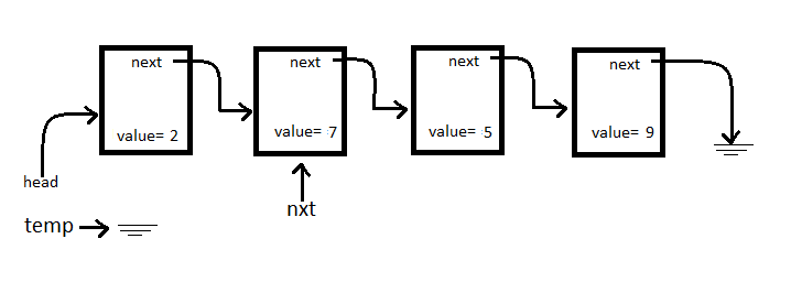 We will have one pointer that will start off assigned to NULL called temp. This will be our new head when we are finished.