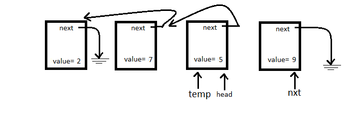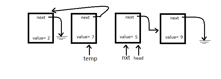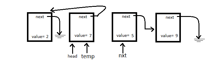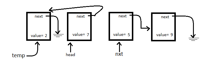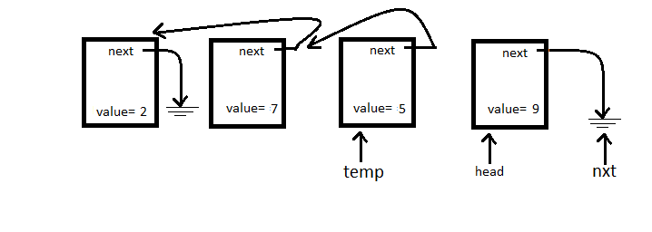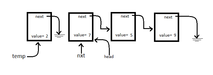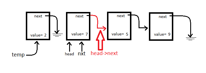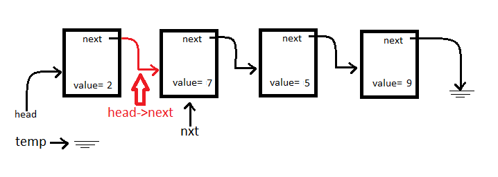 We see head->next from the above diagram, let’s redirect that pointer at whatever temp is pointing to.