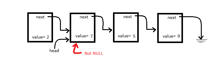 Let’s check if head is NULL, it’s not.
