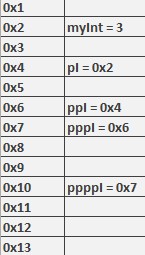 Down in the address 0x4 we have a pointer to an integer, pI. It’s value is the address of myInt, 0x2.