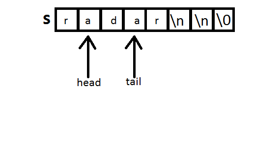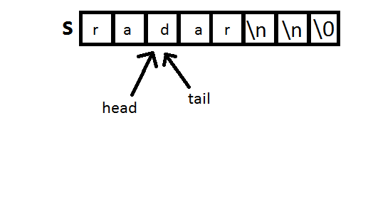 As you can see, head is a pointer to the beginning of the string, and tail points to the last character before the NULL character.