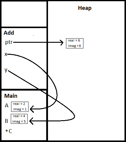 Inside the add function, we use malloc to dynamically allocate space for a Complex object on the heap, and assign its members the sum of the members of the arguments.
